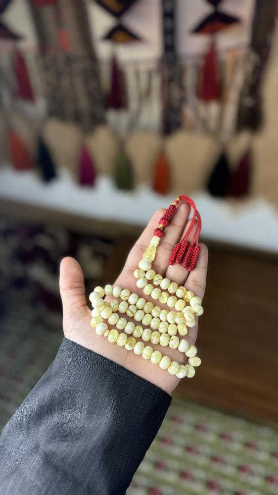 سبحة من خامة مميزة من المستكة المصرية ذات ملمس حريري. تتميز هذه السبحة بلون أصفر معجن رائع.